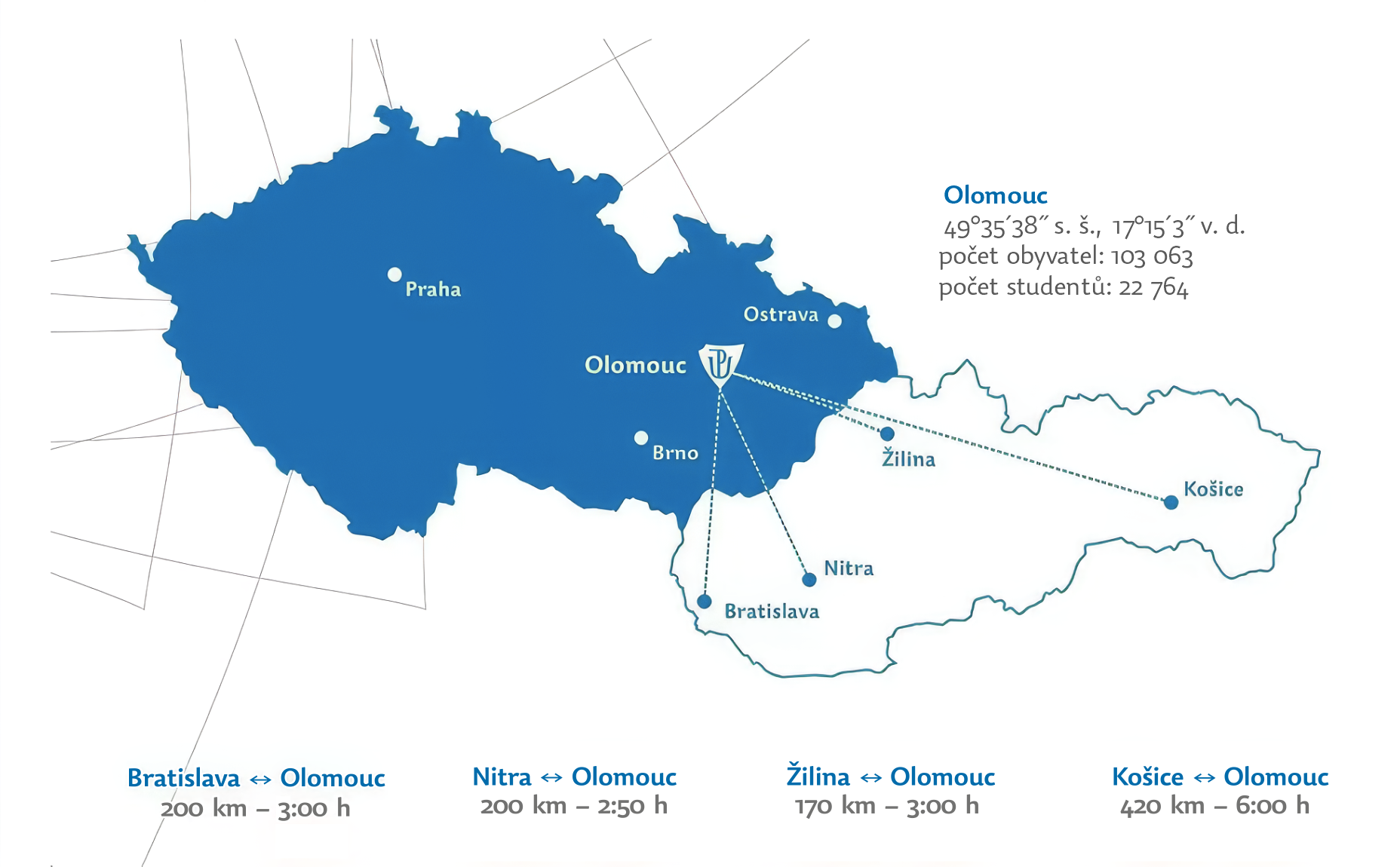 Olomouc je navíc nejen centrem vzdělávání, ale i významným dopravním uzlem, který protínají mezinárodní rychlíkové spoje. Vlakem se k nám tedy pohodlně dostanete za tři hodiny z Bratislavy, nebo za podobnou dobu ze Žiliny. Za šest hodin k nám můžete bez jediného přestupu dojet až z Košic. Více o výhodách studia v Olomouci najdete ZDE.